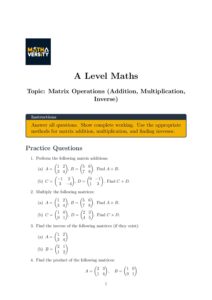Download this free A Level Maths worksheet on matrix operations, including addition, multiplication, and finding the inverse. Perfect for practice, exam prep, and improving problem-solving skills in linear algebra.