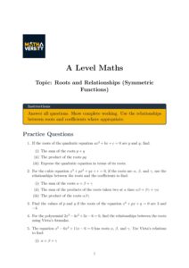 Enhance your understanding of roots and their relationships with this free A Level Maths worksheet on symmetric functions. Practice applying Vieta’s formulas and solving related polynomial problems.