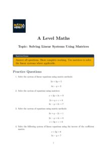Download this free A Level Maths worksheet on solving linear systems using matrices. Practice applying matrix methods to solve simultaneous equations and strengthen your linear algebra skills for exams.